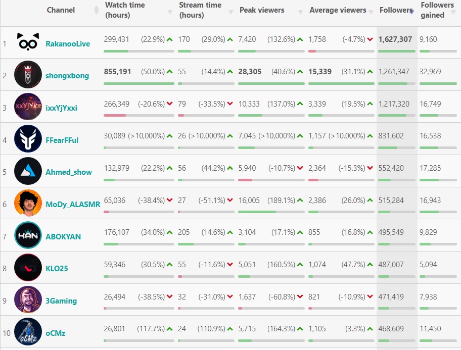 بالانتقال إلى ترتيب القنوات العربية لناحية أعداد المتابعين أو الـ Followers الأعلى في آخر 30 يوماً تأتي قناة ركان RakanooLive في أعلى القائمة مع 1,627,307 متابع وخلال الشهر الماضي تمكنت القناة من جذب 9,160 متابعاً جديداً.