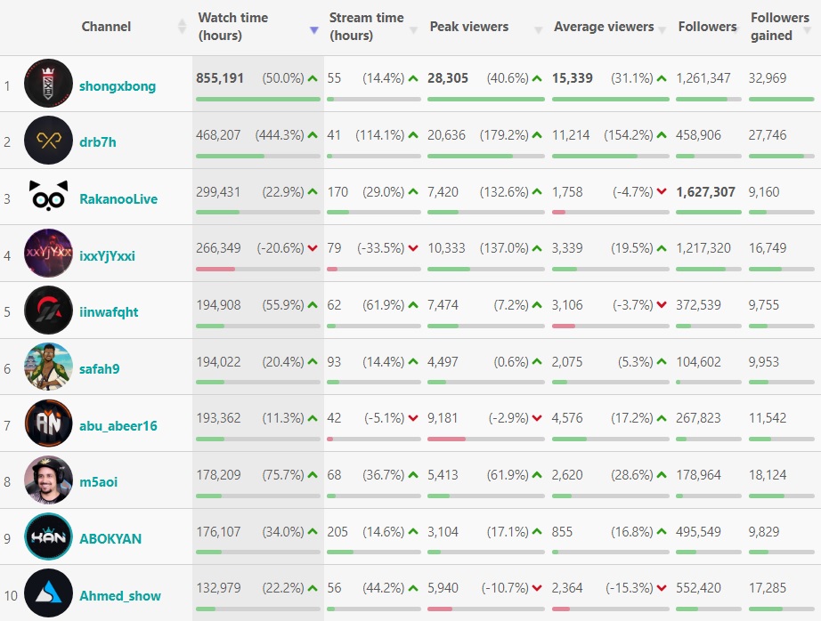 في هذه القائمة لدينا أكثر القنوات التي حظيت بأعلى ساعات مشاهدة خلال يونيو 2022. ففي المركز الأول لدينا قناة shongxbong التي حصدت 855,191 ساعة مشاهدة الشهر الماضي بعد بث 55 ساعة من قبل صاحب القناة. بينما تأتي قناة drb7h ثانياً مع 468,207 ساعة مشاهدة بزيادة مئوية 444.3%. وهذه القناة قامت ببث 41 ساعة لعب بالشهر الماضي.